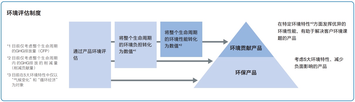 我们建立了环境评估制度,旨在推动欧姆龙的环境措施并提高客户价值。该制度是用于实现可持续经济、从生命周期的视角评估产品并将其环境性能进行可视化的机制。