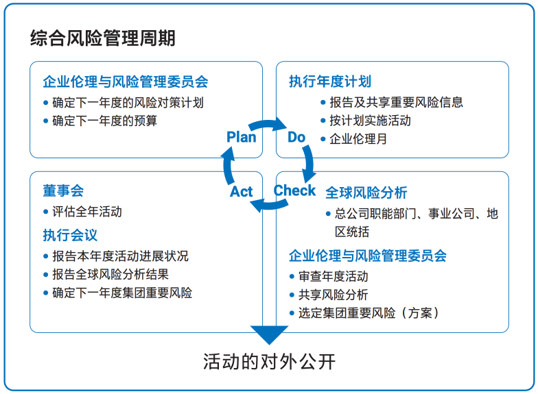 欧姆龙使用称为综合风险管理的集团通用框架来管理风险。经营和事业环境的变化速度日益加快,不确定性不断增加。为了快速应对这些变化,需要提高风险敏感度,在风险显露之前及时察觉并采取措施。努力实施具有活力的风险管理,让现场和经营合力解决在现场无法应对的、因环境变化产生的问题,在全球范围内推动PDCA循环,同时提高本活动的质量。