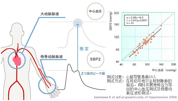 中心动脉血压,又称中央主动脉血压,是指心脏附近的主动脉血压。由于是直接检测施加于心脏等内脏器官的压力,中心动脉血压的检测有助于预测中风、心肌梗塞、心力衰竭等心脑血管方面的疾患。但相对于能够轻松测试的"上腕血压",测量中心动脉血压必须在心脏附近插入导管才行。
